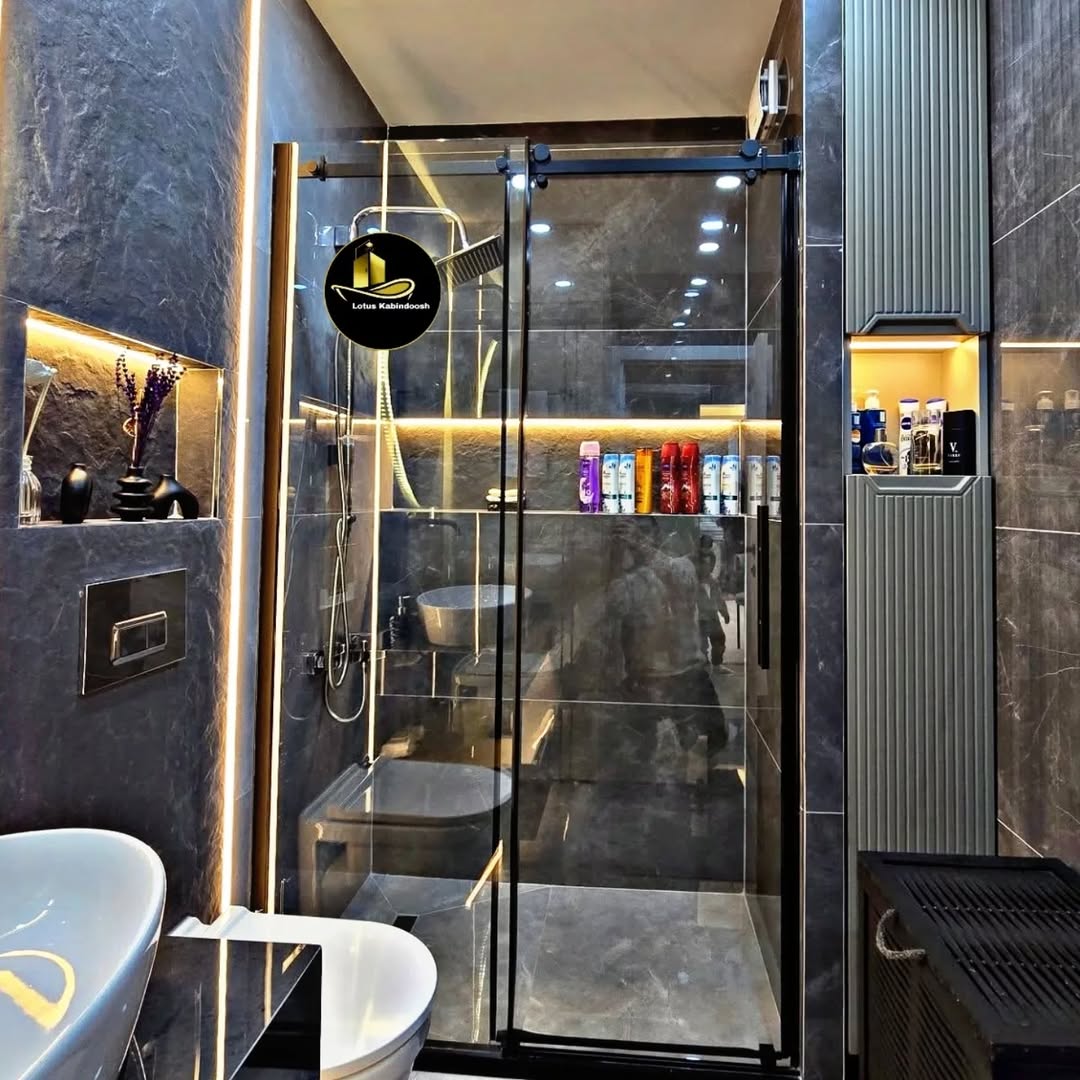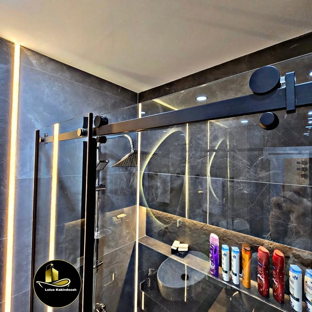 نمای ریل و یراق کابین دوش فریم‌لس لوتوس با طراحی مدرن و مینیمال مناسب حمام لوکس